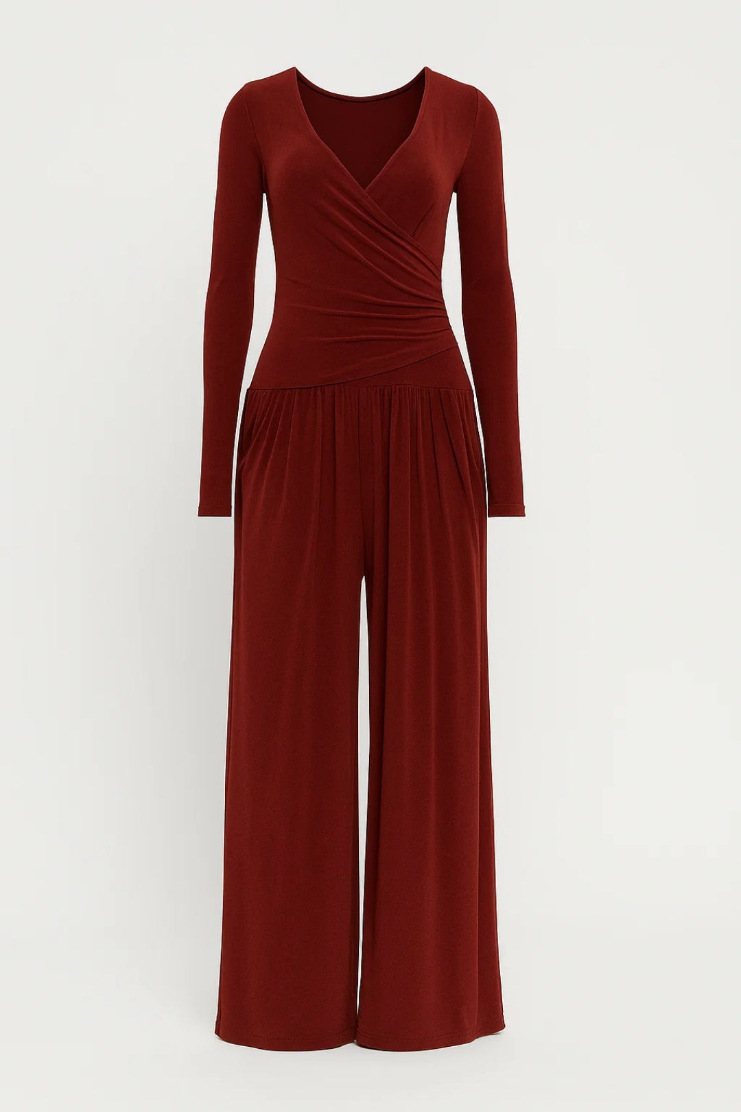 Cet ensemble deux-pièces se distingue par son haut croisé ajusté et son pantalon fluide à jambe large. Une silhouette féminine et moderne, parfaite pour un look raffiné sans effort.