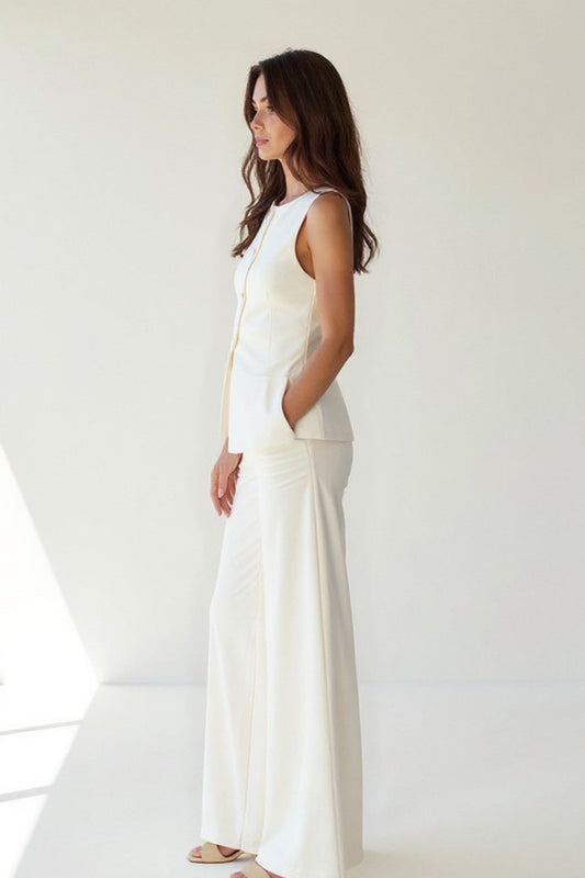 Ce deux-pièces se compose d’une veste droite ceinturée et d’un pantalon à jambe large, créant une silhouette équilibrée et contemporaine.